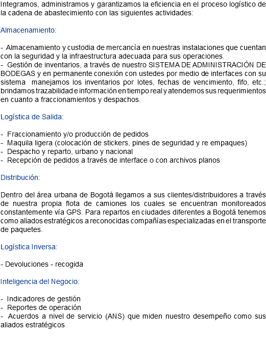 Integramos, administramos y garantizamos la eficiencia en el proceso logístico de la cadena de abastecimiento con las siguientes actividades: Almacenamiento: - Almacenamiento y custodia de mercancía en nuestras instalaciones que cuentan con la seguridad y la infraestructura adecuada para sus operaciones. - Gestión de inventarios, a través de nuestro SISTEMA DE ADMINISTRACIÓN DE BODEGAS y en permanente conexión con ustedes por medio de interfaces con su sistema manejamos los inventarios por lotes, fechas de vencimiento, fifo, etc.; brindamos trazabilidad e información en tiempo real y atendemos sus requerimientos en cuanto a fraccionamientos y despachos. Logística de Salida: - Fraccionamiento y/o producción de pedidos - Maquila ligera (colocación de stickers, pines de seguridad y re empaques) - Despacho y reparto, urbano y nacional - Recepción de pedidos a través de interface o con archivos planos Distribución: Dentro del área urbana de Bogotá llegamos a sus clientes/distribuidores a través de nuestra propia flota de camiones los cuales se encuentran monitoreados constantemente vía GPS. Para repartos en ciudades diferentes a Bogotá tenemos como aliados estratégicos a reconocidas compañías especializadas en el transporte de paquetes. Logística Inversa: - Devoluciones - recogida Inteligencia del Negocio: - Indicadores de gestión - Reportes de operación - Acuerdos a nivel de servicio (ANS) que miden nuestro desempeño como sus aliados estratégicos